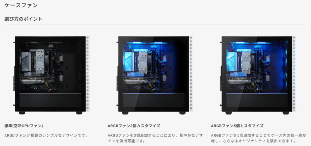 ライティング対応ファンへの変更は、3個の場合+3,000円、5個の場合+5,000円でカスタマイズ可能です。