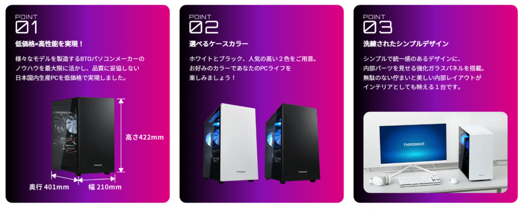 2シリーズともそれぞれ違った魅力がありますが、『サードウェーブ』は特に価格やコスパ重視の人向けのゲーミングPCです。