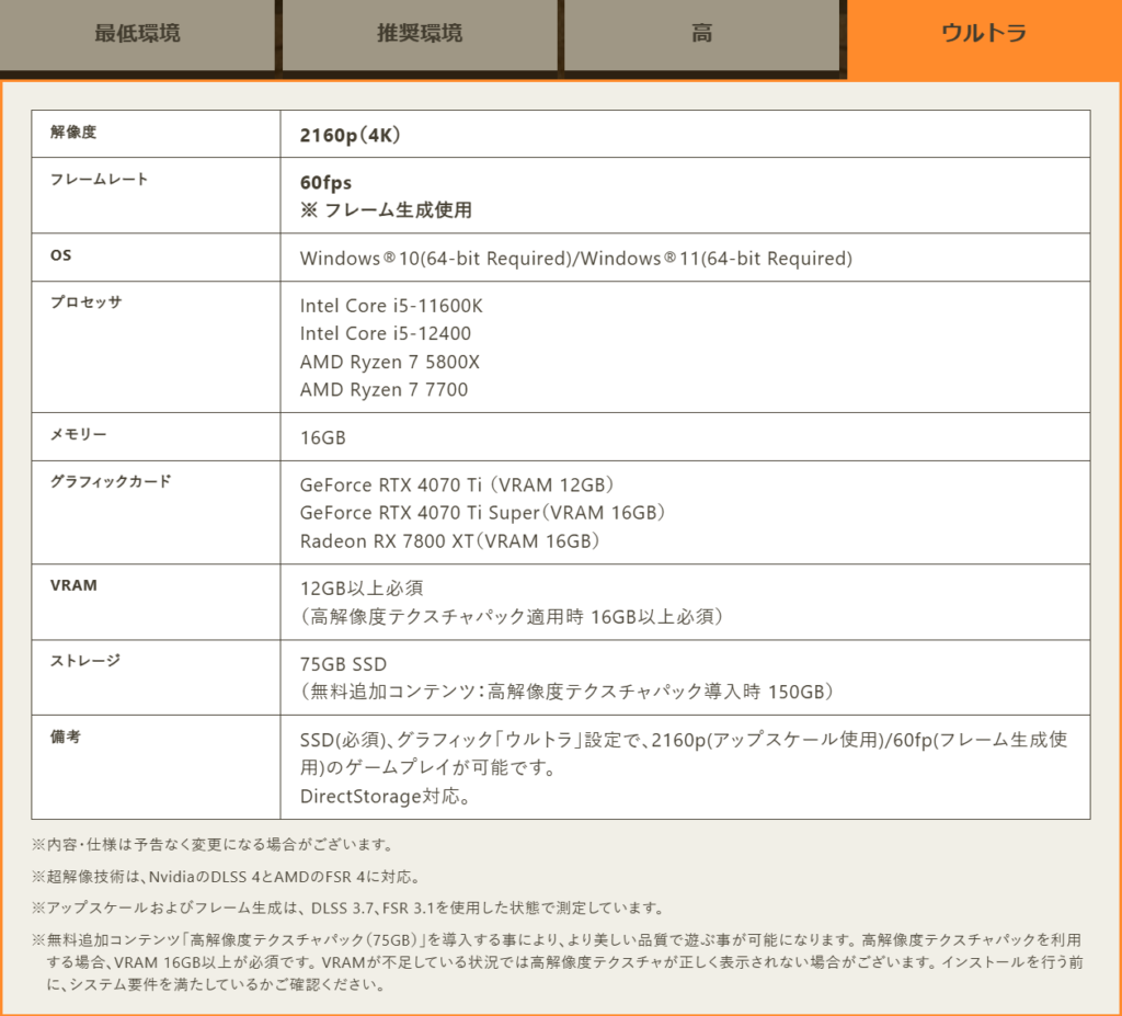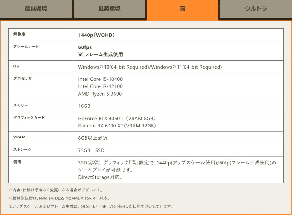 モンハンワイルズウルトラ設定で求められるスペックとほぼ同等性能のため、WQHDや4Kといった高解像度環境でも快適にプレイできます。