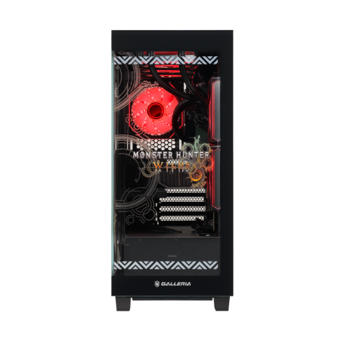全体的に赤色に光るパーツが採用されている他正面にはモンハンワイルズのロゴも装飾されており、THE・コラボPCらしい見た目となっています。